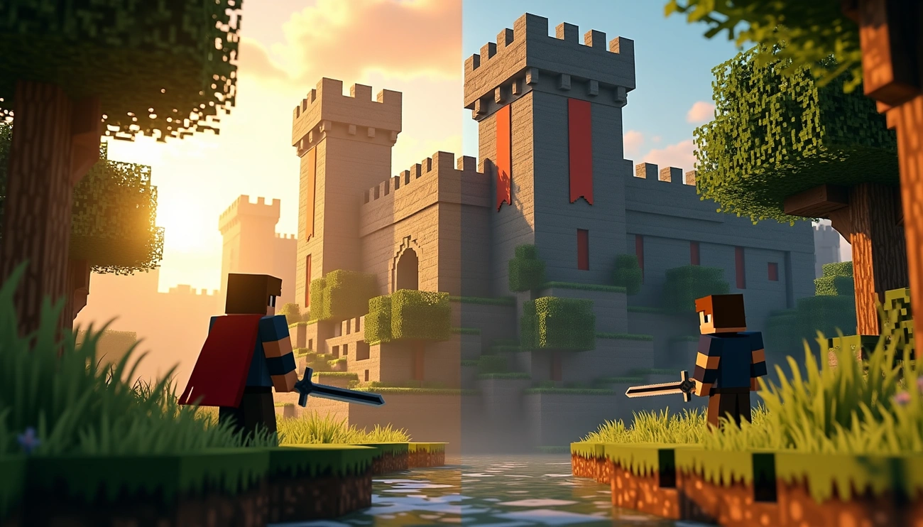 Side-by-side image contrasting Minecraft's blocky world with Hytale's detailed fantasy adventure scene.